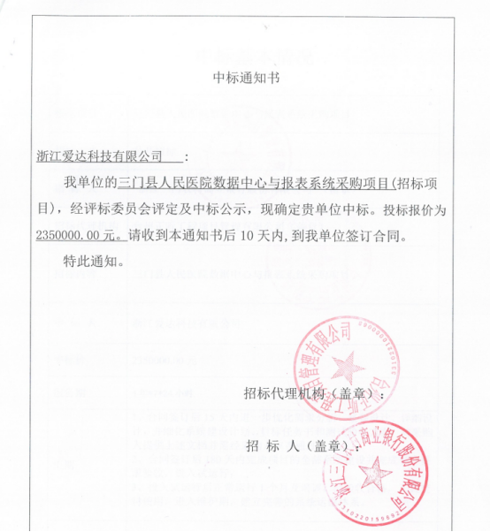 2020年6月29日,我司(浙江愛達科技有限公司)參加了三門縣人民醫院數據中心與報表系統項目的投標活動,并成功以235萬元的金額中標。