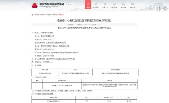 2020年12月22日,我司(浙江愛達科技有限公司)參加了泰安市中心醫院高新院區智慧醫院智能化系統項目的投標活動,并成功以6158萬元的金額中標。